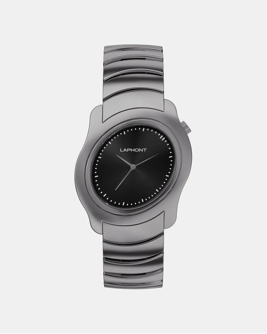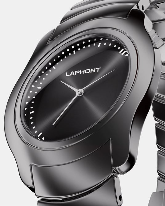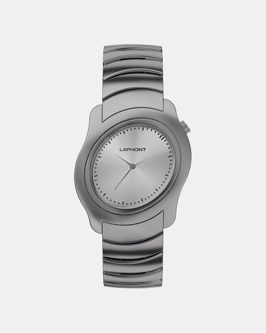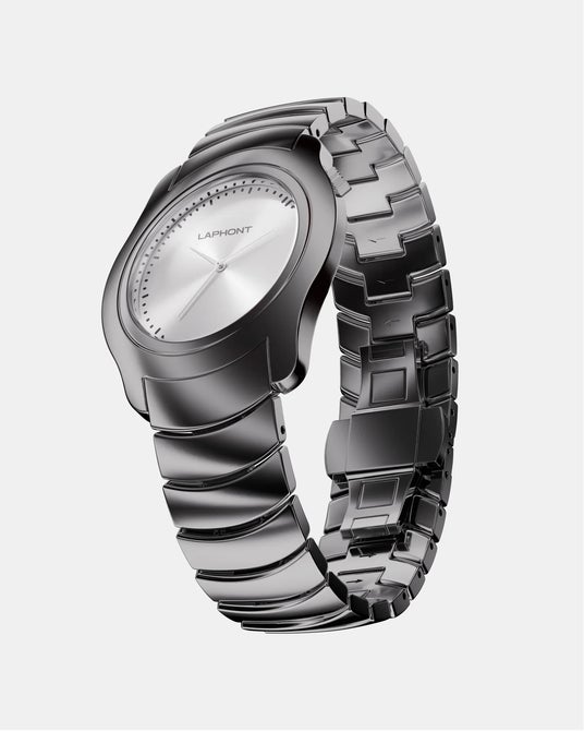 「SIDEWINDER」は、蛇行するような流線型フォルムをまとったアシンメトリー構造のメタルウォッチ。一見ミニマルでありながら、光の角度によって表情を変える有機的な造形は、まるで“呼吸するオブジェ”のように腕の上で生命感を放ちます。ステンレススチール製のケースは、直線と曲線が交錯する立体構造。全面を鏡面仕上げで磨き上げることで、金属の光沢そのものが造形美を際立たせ、見る角度や光の動きに呼応して豊かな表情を描きます。ケースと連続するように設計されたカスタムメタルブレスレットは、静と動のバランスを象徴し、LAPHONTが追求する“構築美としての時計”という哲学を体現しています。