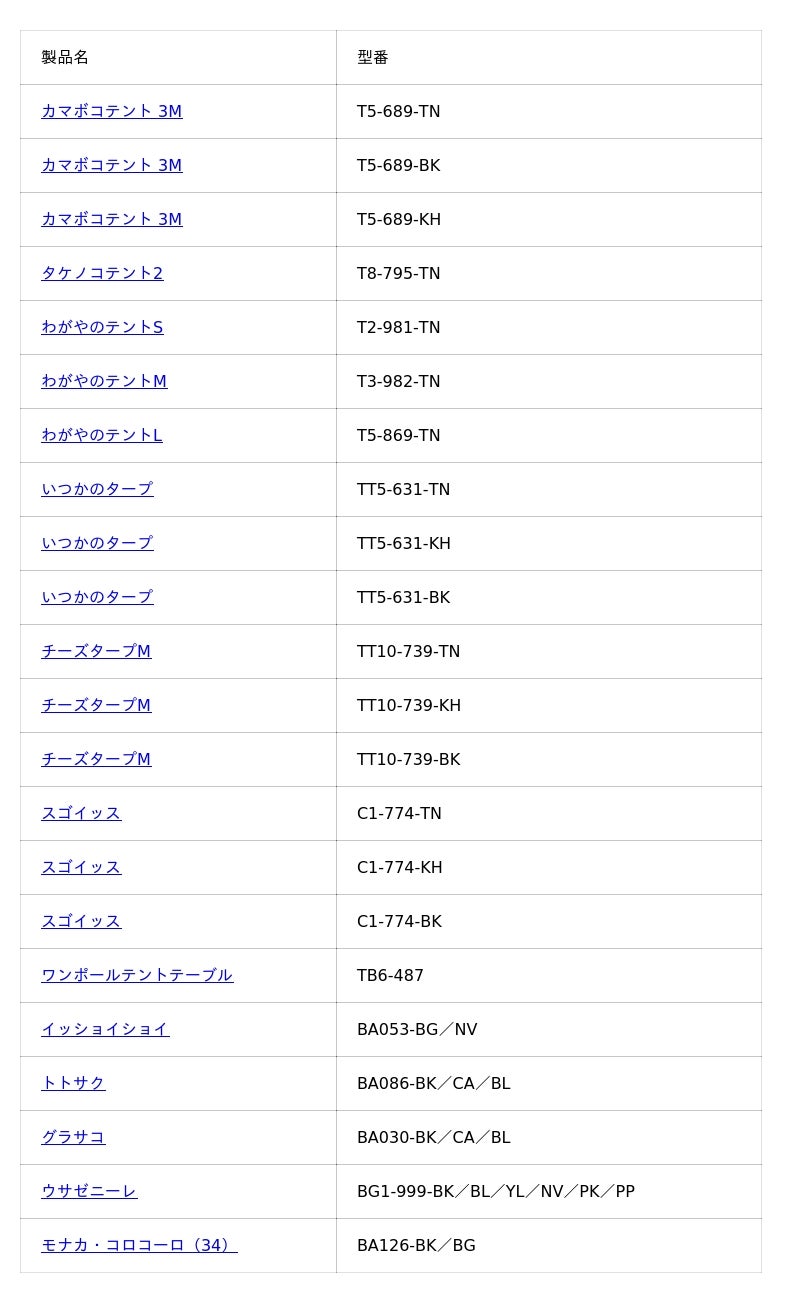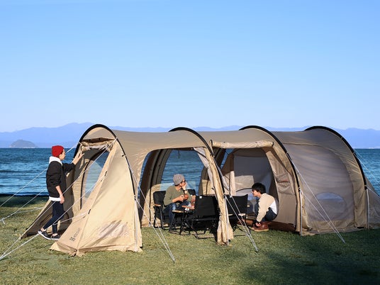 ラインナップにはブランドの代名詞的テント「カマボコテント」各色や、キャンプ以外の日常シーンでも活用できる「スゴイッス」、「モナカ・コロコーロ」などが並びます。