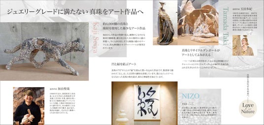 当社はこれまで、アーティストとのコラボレーションを通じ、ネイチャーパールのアップサイクルに取り組んできました。2024年にはダンボール造形作家・玉田多紀氏、2025年には廃材アーティスト・加治聖哉氏との協働を実現。ネイチャーパールを数千個用いた作品が、銀座店をはじめとする店舗で展示され、高い注目を集めました。