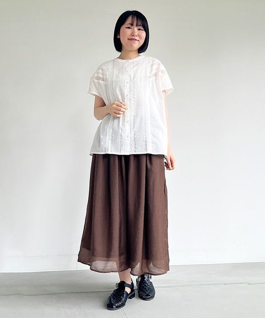 コーデポイント白のコットンブラウスにシアースカーチョを合わせた、ナチュラルなスタイル。ブラウスには、ピンタックやレースの繊細なデザインが施されており、女性らしくフェミニンな印象に仕立ててくれます。