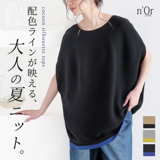コーデポイントコクーンシルエットのトップスで大人の抜け感を演出。パキっとした配色の裾ラインがコーデのポイントになります。ボトムスには配色デザインが効いたデニムを合わせ、上下丸みのあるシルエットで、ラフでモードな印象にまとめました。