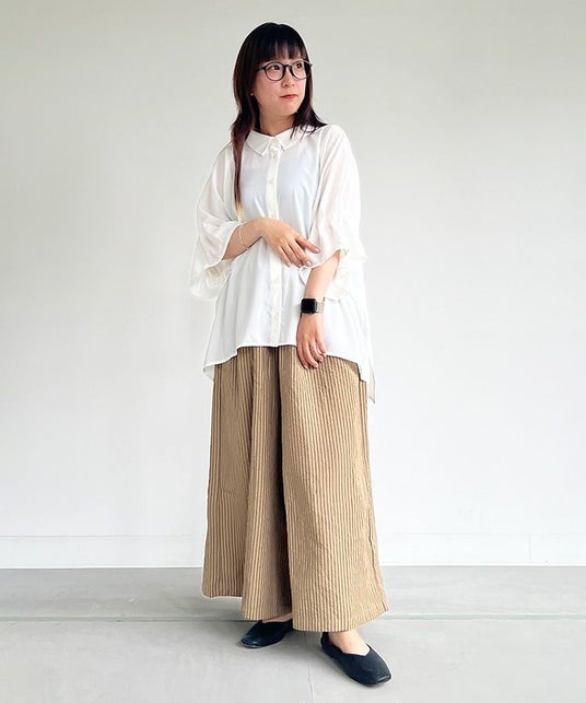 コーデポイント落ち感のあるシャツはラフで女性らしい印象に。ボトムスには、細めのストライプデザインできれいめな印象もありつつ、シルエットはワイドでラフなパンツを合わせました。ぽこぽことした生地がナチュラル感を演出します。