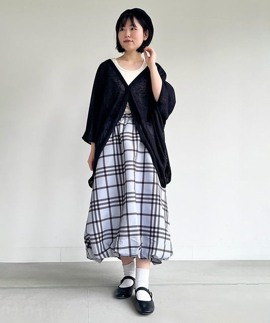 コーデコメント透かし編みカーディガンとサーモ素材のベレー帽でナチュラルな雰囲気に。スカートのチェック柄やバルーンシルエットがフェミニンさをプラスし、甘すぎない大人のかわいらしさを演出します。