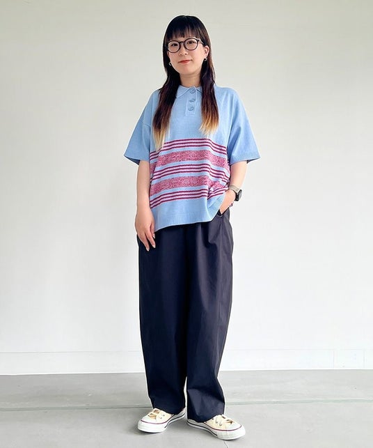 コーデポイントトレンドのマニッシュなラインデザインポロシャツと、ラフなイージーパンツを合わせたボーイッシュスタイル。抜け感がありつつも、ラフさとお洒落さを兼ね備え、普段使いにぴったりの着こなしです。