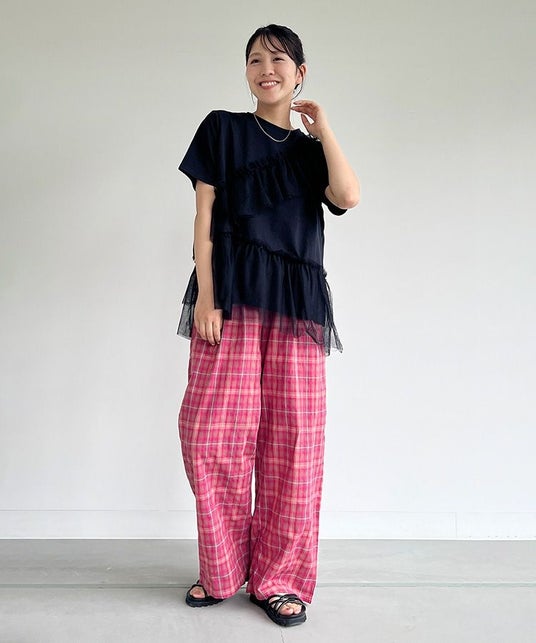 コーデポイント華やかな印象のチュールがドッキングされたブラックのTシャツに、ボトムスは遊び心のあるピンクのチェックパンツを合わせました。黒×ピンクの目を惹くコーデで女性らしさもありながら、カジュアルな印象に仕上がります。