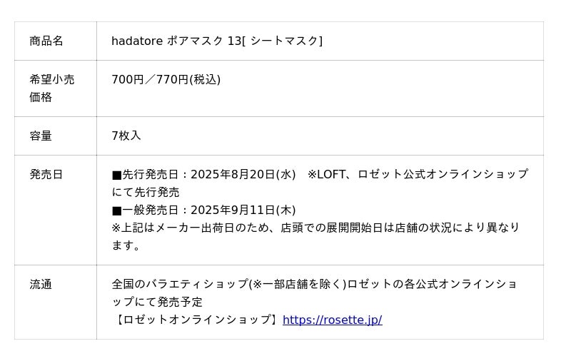 ロゼット株式会社(本社:東京都品川区、代表取締役社長:藤井 敬二)が展開する『Rz+ by ROSETTE』(アールゼットプラスバイ ロゼット)のシートマスクブランド『hadatore(ハダトレ)』から、毛穴悩みに集中アプローチする毛穴ケア用シートマスク「hadatore ポアマスク 13」を発売いたします。