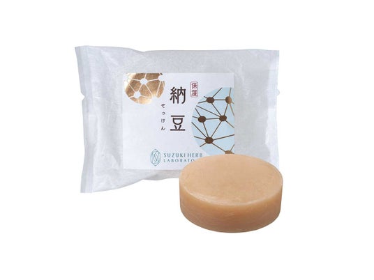 納豆ローションにも含まれる「ポリグルタミン酸」、植物性コラーゲンの「ナットウガム」など、美容液にも十分使用できるハーブエキスをそのまま練り込んだ贅沢なせっけん。キメ細かく濃密でもっちりとした泡で、毛穴の汚れまできれいに取り除きながら美肌成分を肌にいきわたらせます。