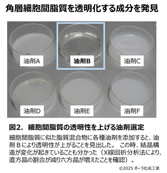 黒鉛とダイヤモンドは、どちらも炭素でできているのにもかかわらず見た目の透明度が全く異なります。両者の違いを生むのは「結晶構造」です。実は、角層中の細胞間脂質も「結晶構造」を有しており、その構造は主に2種類あることが知られています(補足資料1)。このことから化粧品の成分を細胞間脂質に作用させ、結晶構造をコントロールすると、透明度に違いを出せるのではないかと考えました。そこで実験的に細胞間脂質に各種油剤を作用させて結晶構造を調べ、透明度を高めることのできる油剤を選定(図2)。この油剤により角層を透明化できることを見出しました(図3)。