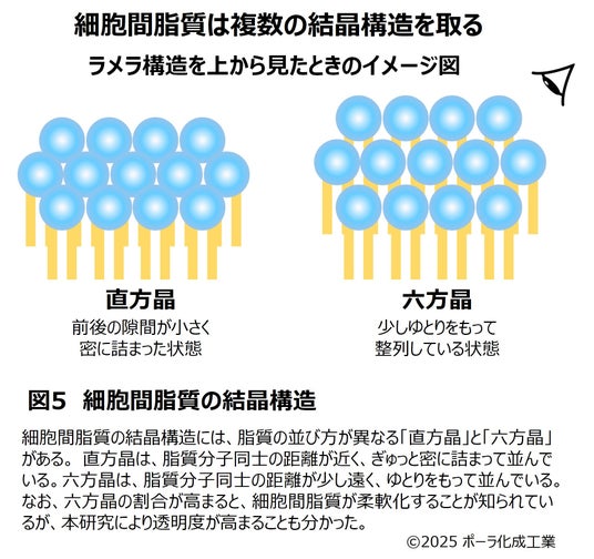 ダイヤモンドも黒鉛も同じ炭素原子でできていますが、原子同士の結合の仕方(立方晶、六方晶)によって見た目が大きく異なります(図4)。このことから、細胞間脂質においても結晶状態の違い(図5)が見た目に違いを与えるのではないかと考えました。