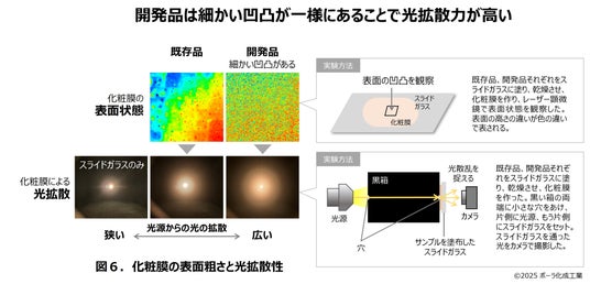 化粧膜表面に適度に細かな凹凸を作ることで、光拡散性を増すことができることが知られています。そこでさまざまな油剤について化粧膜表面への作用を検討し、ある特定の油剤が表面に細かい凹凸を生み出すことを見出しました。その油剤を配合することで、開発品では化粧膜の表面に細かな凹凸ができていること、そして化粧膜を通した際の光拡散性が高いことが示されました(図6)。
