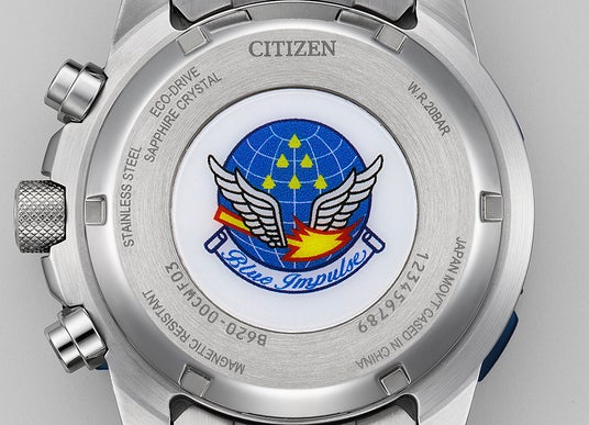 ・文字板と裏ぶたにエンブレムを配置。ブルーインパルスの現行機種 T-4 の飛行シーンフォトカードを同梱した、ロゴ入りの専用BOX付。