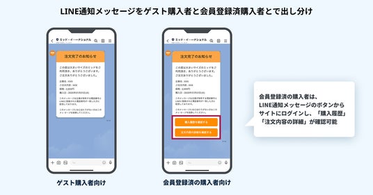 このたび、さらなる利便性向上を目的にLINE通知メッセージを導入し、友だちであるかどうかに関わらず、ご購入いただいたお客様に「注文完了のお知らせ(購入完了通知)」「商品発送のお知らせ(発送完了通知)」をお届けできるようになりました。