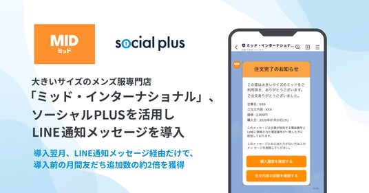 株式会社ソーシャルPLUS(所在地:東京都港区、代表取締役:佐藤 亮介)は、株式会社マンチェス(本社:岐阜県岐阜市、代表取締役:高見澤 聡)が運営する大きいサイズのメンズ服専門店ミッド・インターナショナルにおけるLINE通知メッセージ導入において、LINE公式アカウントの拡張ツール「ソーシャルPLUS」が採用されたことをお知らせします。