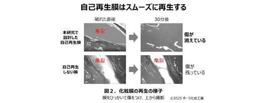 ポーラ・オルビスグループの研究・開発・生産を担うポーラ化成工業株式会社(本社:神奈川県横浜市、社長:片桐崇行)は、壊れても自己再生する化粧膜の技術により、従来では難しかった化粧膜中へ水分を長時間保持することに成功しました。