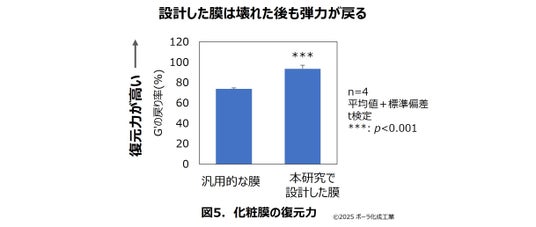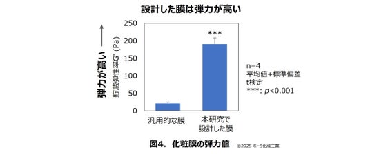本研究で設計した化粧膜は、汎用的なポリマーの化粧膜に比べ、弾力を示す指標の値が高いことが判明しました(図4)。