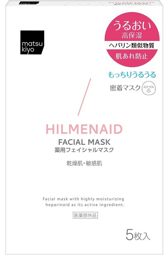 第2弾の「matsukiyo ヒルメナイド薬用フェイシャルマスク」は、 “顔の集中保湿ケア”が可能なフェイシャルマスク。これまでは医薬部外品の化粧水や乳液等に配合されることの多かった「へパリン類似物質」を配合した高保湿マスクで、乾燥による肌荒れを防ぎながら角質層のすみずみまでうるおいを補給します。