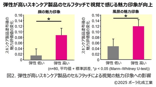 では、触覚でaPFCが活性化すると他の感覚での魅力の印象も実際に変化するのでしょうか。そこで、弾性の高いスキンケア製品を自分の肌に塗り、aPFCが活性化した時に、視覚から感じる魅力印象が高まるのか検証しました(補足資料2)。2種類(弾性が高い/低い)のスキンケア製品を肌に塗布した後に、ディスプレイ上に映る画像に対して評価していただいた結果、顔画像と風景画像に対する魅力印象が高まることを見出しました(図2)。