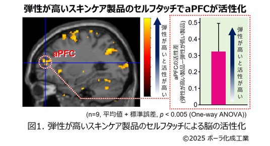 我々は過去の研究から、aPFCが「魅力認知の要」であり、この部位が活性化すると視覚や触覚などいろいろな感覚(五感)で魅力を感じやすくなる可能性を示しています(※1)。この知見から、普段の生活で使用するものでaPFCを活性化できれば、日常生活がより豊かになるのではと考えました。そこで、着目したものが毎日の肌の手入れに欠かせないスキンケア製品です。aPFCは心地よいと感じた時に活性化することが知られています。また、自分の肌に塗って心地よいと感じるスキンケア製品は弾性が高いことがわかっています(※2)。そこで、弾性が高いスキンケア製品を自分の肌に塗った際の脳反応について検証(補足資料1)したところ、aPFCを活性化する効果があることが分かりました(図1)。