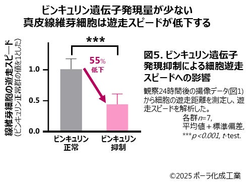 次に、ビンキュリンが減少した真皮線維芽細胞では、実際に遊走スピードが変化しているかを検証しました。その結果、ビンキュリン発現量を人工的に減少させた細胞では、正常な細胞と比べ、遊走がゆっくりになっていることを確認しました(図1、補足資料3)。つまり、シワ部位では真皮線維芽細胞のビンキュリン発現量が減少することで、遊走スピードが遅くなっていることが示されました。