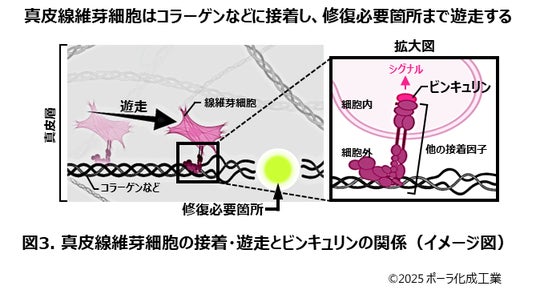 真皮線維芽細胞は、まるで人間がボルダリングをする際に手や足を近くの足場に掛けて一歩ずつ進んでいくように、近くのコラーゲンやエラスチンなどを足場として接着しては、細胞の形状を伸び縮みさせて、遊走しています。その際に重要な役割を果たすのが、接着因子と結合し細胞膜の内側に存在する「ビンキュリン」というタンパク質です。ビンキュリンは、細胞周囲で何かに触れた機械的な力を化学的なシグナルに変換して、細胞外の情報を細胞内に伝え、遊走と恒常性を保つ役割を担っていると言われています(図3)。