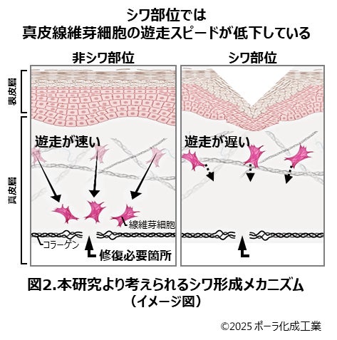 以上の結果から、シワ部位では真皮線維芽細胞が適切な箇所へすぐに到達できず、コラーゲンなどの産生や修復が滞ることがシワ形成に関与すると考えられます(図2)。