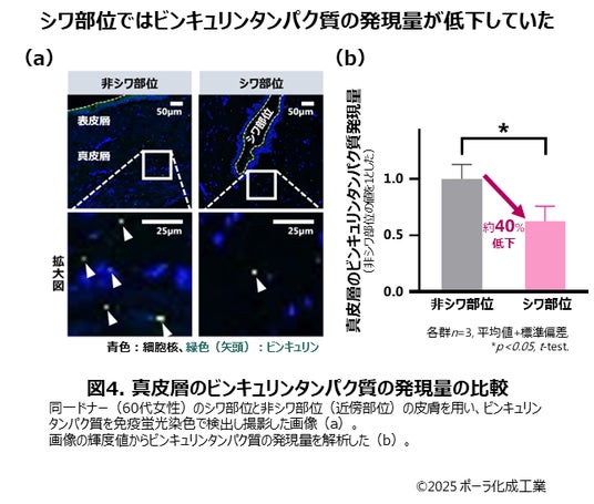 同一人物の顔のシワ部位と、その近くのシワが無い部位の皮膚を用い、ビンキュリンに目印を付けました。解析の結果、シワ部位の真皮では、シワの無い部位の真皮と比べ、ビンキュリンタンパク質の発現量が低下していることが分かりました(図4)。