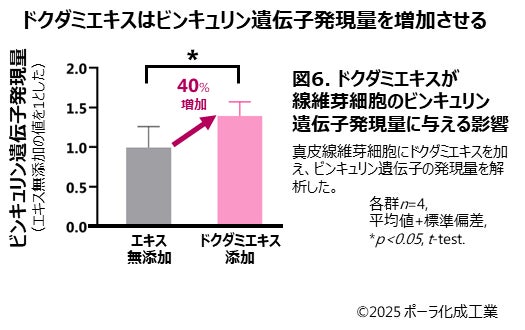 上記検討から、シワ部位で低下しているビンキュリンについて、その遺伝子発現量を増やす化粧品用植物エキスを探索しました。さまざまな候補植物エキスを、真皮線維芽細胞と反応させて調べたところ、ドクダミエキスが、真皮線維芽細胞のビンキュリン遺伝子の発現量を有意に増加させることが分かりました(図6)。
