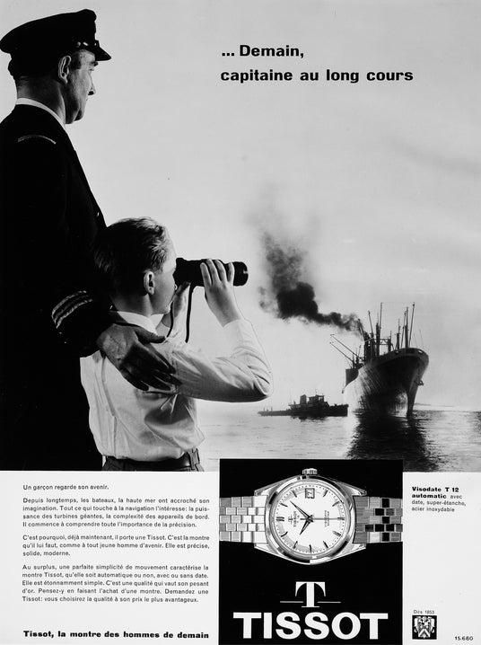 1955年から1959年にかけて、ティソはVisodateの明確で信頼性の高い日付表示機能に焦点を当てた短編広告フィルムを制作しました。これらの作品は、Visodateが着用者にとって不可欠なパートナーであることを訴求しています。登場する人物のスタイルや背景はさまざまでありながら、このシンプルで時代を先取りした機能の価値を明確に表現しました。