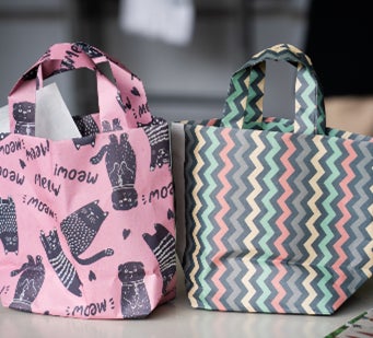 新聞用紙を無駄なく利用するという取り組みから生まれたデザイン新聞「つつむ」や「とにかくでかいぬりえ」など、オリジナルのアップサイクル商品を販売します。また、体験型ワークショップ「つつむでカバンをつくろう!」では、自分が好きな柄の「つつむ」を選んで実際にカバンづくりを体験いただけます。