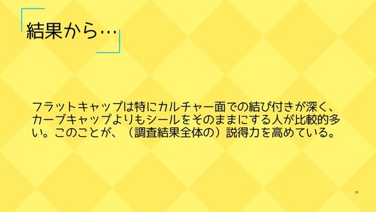 この授業内で学生が実際に企画・データ分析した成果から、特に優秀と評価したレポートをシリーズで公開します。2026年第2弾のテーマは「キャップのシール、剥がす? 剥がさない?」です。ZOZO・Instagramから収集したデータを情報ソースとして、様々な観点からデータに基づいた分析が行われています。