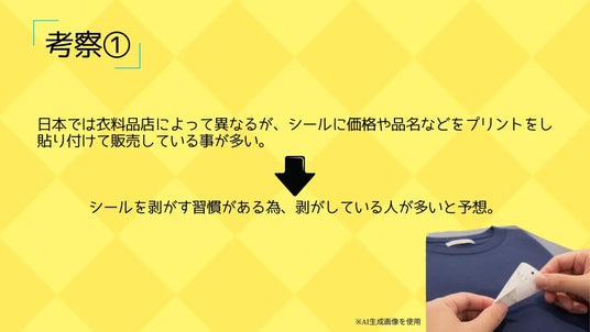 キャップのシールを剥がすか剥がさないか。服飾学生が休憩時間に繰り広げていそうな論争のテーマに「らしさ」を感じるとともに、それを数値的に解明しようとする取り組みがとても面白いと思います。
