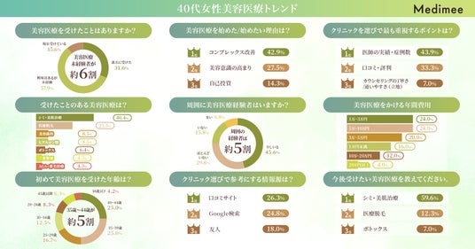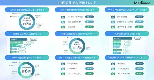 株式会社FoR/FoRINC.(本社:東京都渋谷区、代表取締役社長:高橋知暉)は、「美容クリニックをもっと身近に」をビジョンに掲げるサイト「Medimee」にて、美容医療に関する情報を発信しています。今回は、40代の男女を対象に、「40代美容医療トレンド調査」に関するアンケート調査を実施しました(Medimee調べ)。