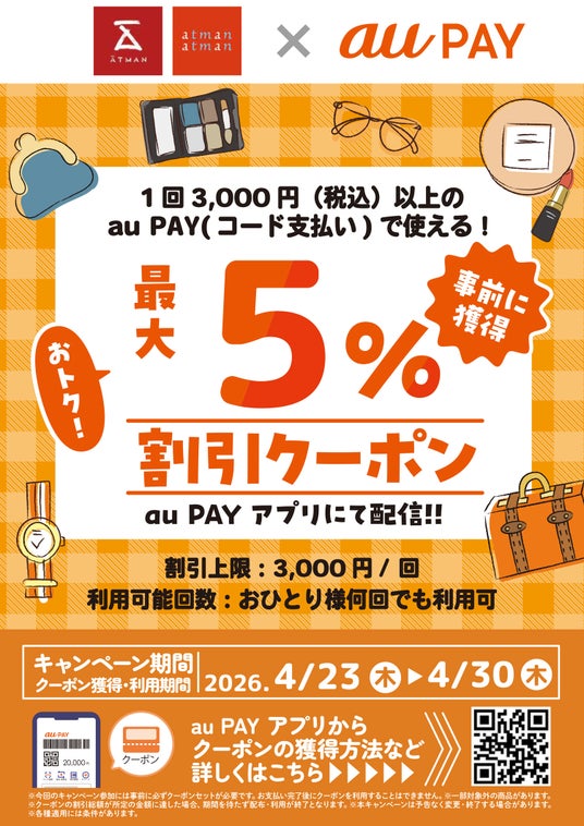 京王グループでコスメを中心に生活雑貨を販売する株式会社京王アートマン(本社:東京都多摩市、以下 京王アートマン)は、2026年4月23日(木)から2026年4月30日(木)まで対象店舗にてご利用いただける「au PAY 最大5%割引クーポン」を実施いたします。