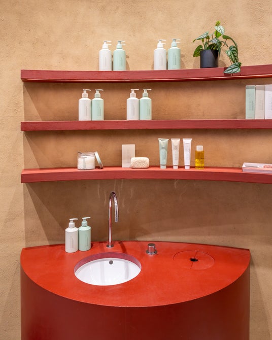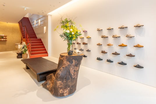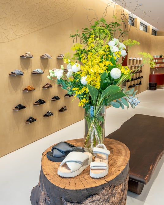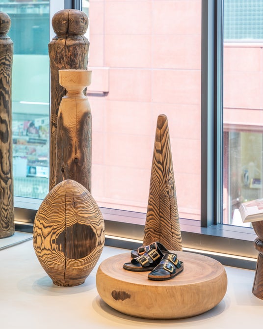 店内は、BIRKENSTOCKのクラフトマンシップと素材の魅力を引き立てるミニマルな設計。ホワイトを基調に、伝統的な手法で仕上げた土壁を取り入れ、コルクやブランドらしいボーンパターンといったブランドを象徴する要素が、緻密に計算されたレイアウトで配置されています。ギャラリーのような空間に有機的なアクセントを添えるのは、ウッドアーティスト高橋成樹氏によるオブジェのようなスツールや什器。無垢材を削り出して生まれる一点物の作品は、一人ひとりの自然な歩みを支えるというBIRKENSTOCKのパーパスと響き合います。都市の中心にありながら、静謐さと有機的な温かみを兼ね備えた空間で、ゆっくりと製品と向き合うことができます。