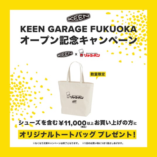 オープンを記念して、シューズを含む11,000円(税込)以上お買い上げの方に、福岡県はもちろん九州を中心に、中国・四国地方で人気の「リョーユーパン」とコラボレーションした 「KEEN x リョーユーパンオリジナルトートバッグ(非売品)」 をプレゼント*数量限定。なくなり次第終了
