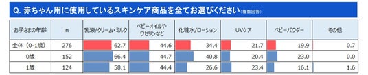 スキンケア商品の中でも人気があるのは乳液やクリーム・ミルクタイプで62.7%の方が利用していました。化粧水やローションは1歳になると使用率が下がっています。