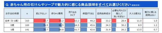 また、最も魅力を感じる説明を単一回答で選択する問いの結果を見ても、「肌にやさしい」「赤ちゃん専用」「泡で出るタイプ」がTOP3である点は変わりませんでした。