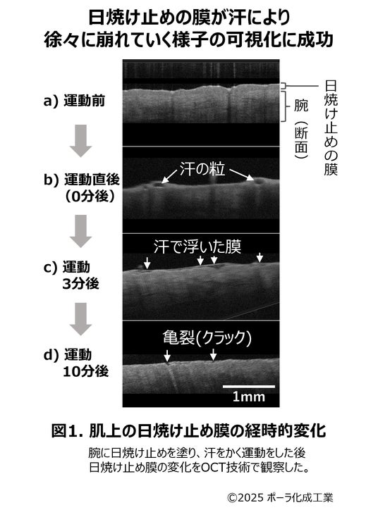 ポーラ・オルビスグループの研究・開発・生産を担うポーラ化成工業株式会社(本社:神奈川県横浜市、社長:片桐崇行)は、横浜国立大学と共同で汗で日焼け止めが肌から剥がれる様子を可視化することに成功しました。この技術により、日焼け止めが剥がれるメカニズムの解明が進み、心地よい感触でありながら汗に強い新たな日焼け止めを開発することが可能となります。