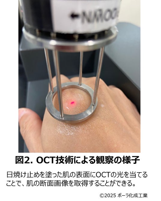 本研究では、従来の耐久性評価法で不可能だった「肌上でのリアルタイム観察」に挑戦しました。これまでの日焼け止めの耐久性評価は、実験用プレートに日焼け止めを塗り、プレートを水に漬けてしばらくしてからプレート上に残った量を評価するもので、剥がれる過程の様子やメカニズムまでは分かりませんでした。そこでポーラ化成工業では、非侵襲で肌の表層を数㎛レベルの解像度で観察し続けることができる、OCT(Optical Coherence Tomograpy)技術(補足資料1)に着目し、独自の技術改良を加えました。