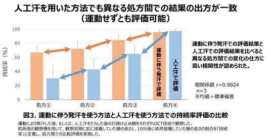 実際の運動を伴う方法と、人工汗を使う方法とで、日焼け止め膜の持続性を比較したところ、両試験法で処方間での変化の仕方が類似していることがわかりました(図3)。この結果をもとに、今後は人工汗を使うことで簡易かつ効率的に数多くの処方を評価できるようになり、より迅速にメカニズム解明が進むと考えられます。