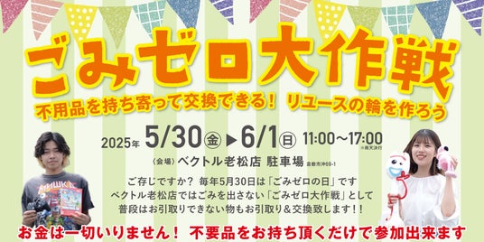 ファッションアイテムの買取や販売を手掛ける株式会社ベクトル(本社︓東京都港区、代表取締役︓村川智博)は、「ごみゼロの日」として制定されている2025年5月30日(金)から3日間に渡り、誰でも無料で参加できる物々交換イベント「ベクトルごみゼロ大作戦」を岡山県倉敷市で開催します。