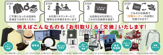 イベント当日に、自宅のクローゼットや押し入れで眠っている不用品を会場にお持ち込みください。お持ち込み点数に応じ、お引取りカウンターで「ごみゼロ交換券」をお渡しいたします。交換券1枚につき、会場に置いてあるアイテムの中から気に入った商品を1つ選び交換することが可能です。持ち込み点数に制限はございません。書籍やスポーツ用品など、普段ベクトル老松店では取り扱っていないアイテムも交換または引き取り対象となっております。皆様に気持ちよくリユース体験をしていただくため、「汚れ・ダメージが少ない商品」のお持ち込みをお願いしております。
