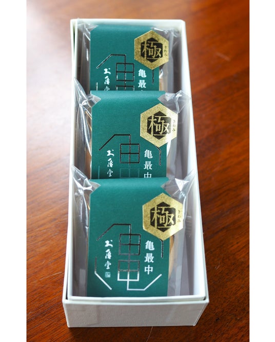 - シンボルマークとしての「極・亀」中央には「亀」の字を象ったロゴ。帯の端には金箔風のシールで「極(きわみ)」の文字を配置し、唯一無二の存在感を放ちます。