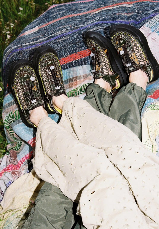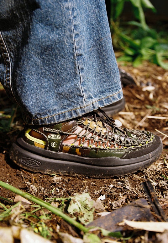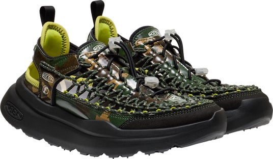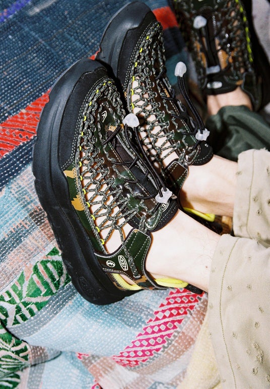 ベースにはアッパーをコードで形成した革新的な一足UNEEKに、カーブを描くソールユニット「キーン・カーブ(KEEN.CARVE)」を融合した「UNEEK WK(ユニーク ダブルケー)」をピックアップ。リアルとデジタルの中間で表現したFAFの定番でオリジナルのカモフラージュ柄と、パテント仕様のコンビネーションが唯一無二の世界観を演出。戦場では御法度となるネオンカラーを配し、不協和音と反戦への意を表現した一足です。