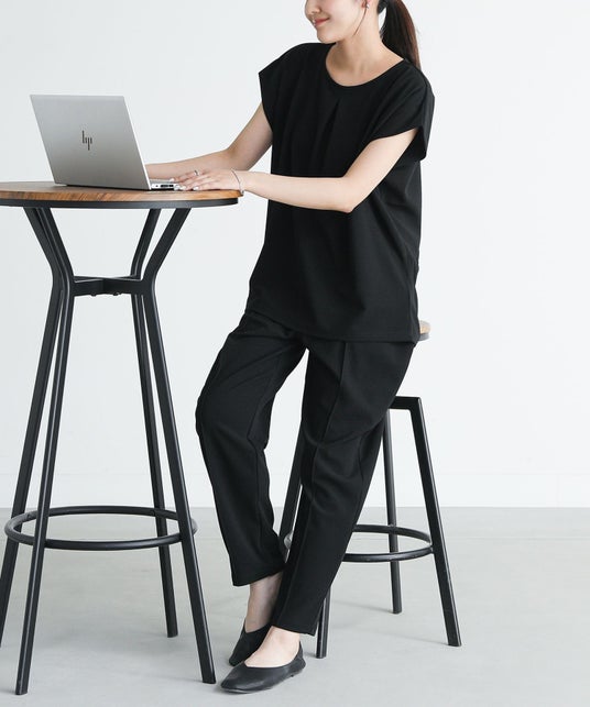 トップスのみでも十分オフィススタイルになりますが、同日発売される同素材のパンツと合わせて、セットアップとして着用いただくとよりキレイ見えし、オフィススタイルとしてご利用いただけます。