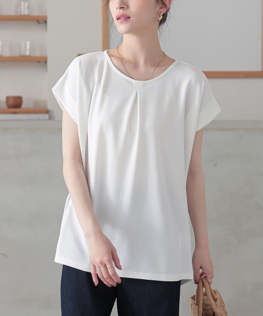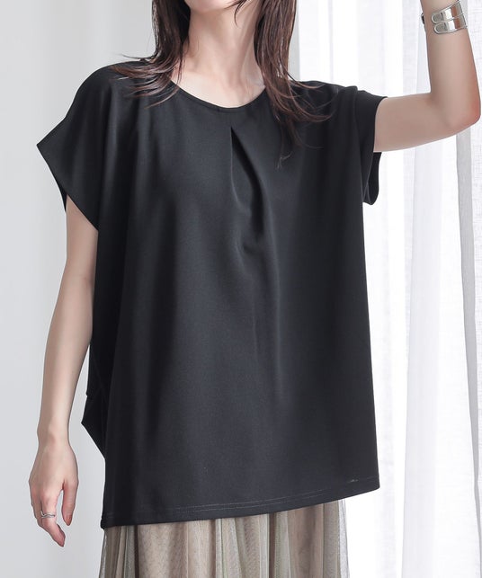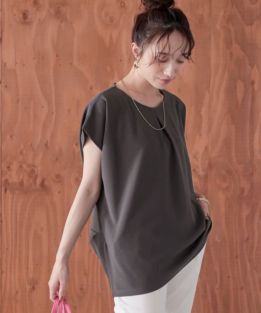 また、気になるおしり周りは、タックが自然に落ちることで生まれるドレープでカバーしてくれます。二の腕が見える肩先にも工夫があり、内側に畳んだ生地が独特なフォルムになるので、少し長めのフレンチスリーブで、二の腕がすっきり見えるデザインになっています。