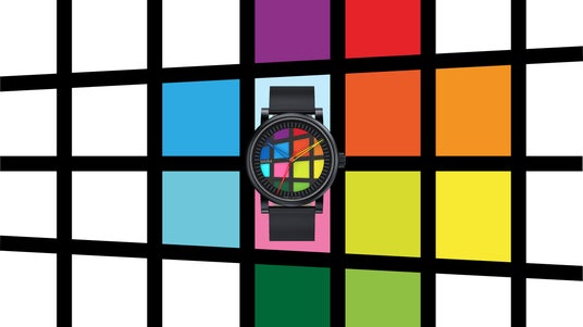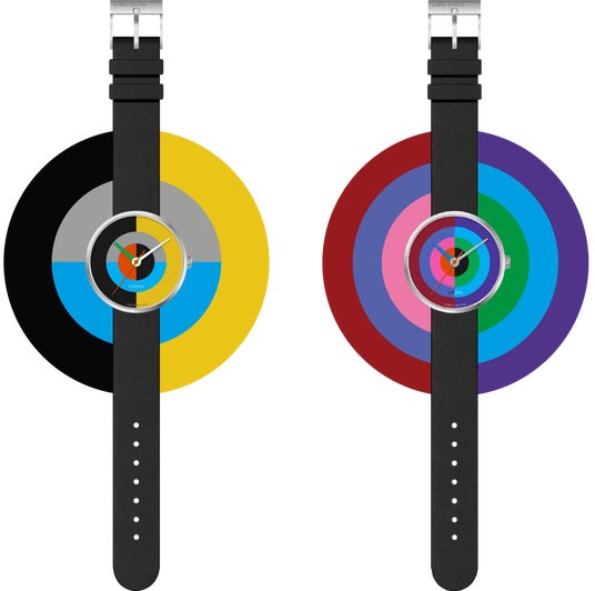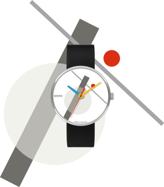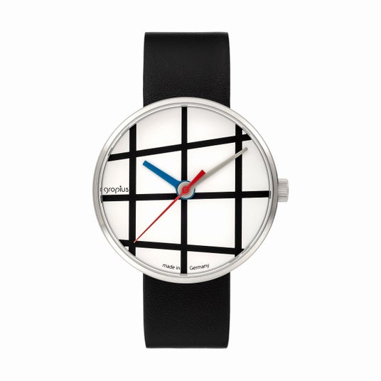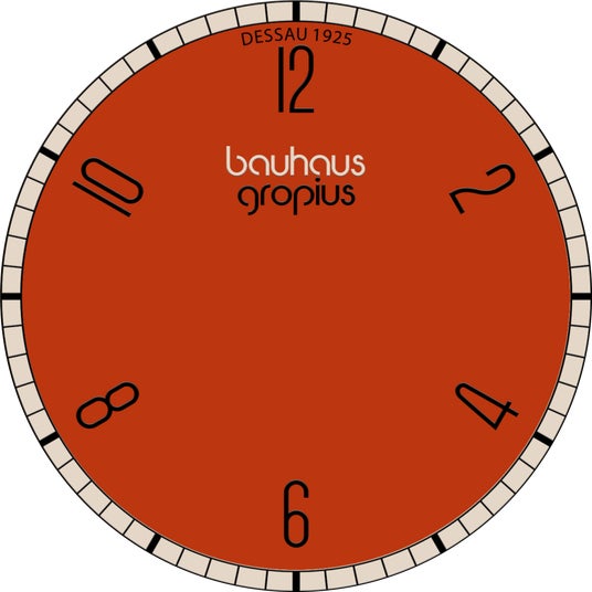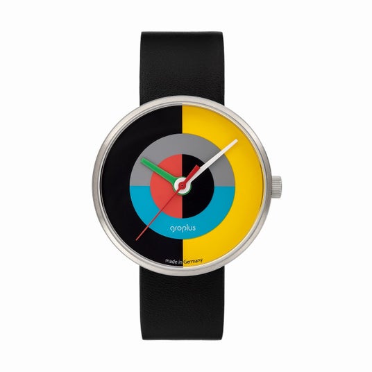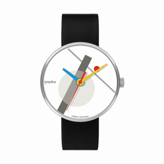 時計のデザインは、グロピウスのデザイン様式を模倣するのではなく、再解釈し、赤・青・黄の三原色を基調とした鮮やかな色彩、カラフルな針、グラフィックを用いて表現しています。