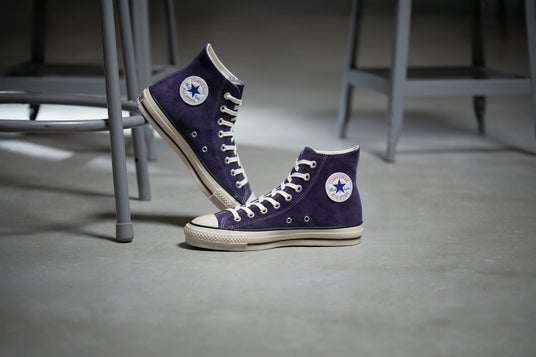上質な国産スエードをアッパーに採用したMADE IN JAPANのオールスター。グレープカラーのスエードや生成りのテープとコットンシューレースを組み合わせることデッドストックにありそうな雰囲気を演出しています。またMADE IN JAPANモデルの特徴でもある80年代のラストを採用し、トウスプリングを低めに設定したシャープなシルエット。さらに、 80年代のヒールラベルをベースに、「MADE IN U.S.A.」の表記を「MADE IN JAPAN」に変更したアーカイブ由来のディテールを踏襲しています。また、クッション性と反発性に優れた配合のラバースポンジをインソールに採用。