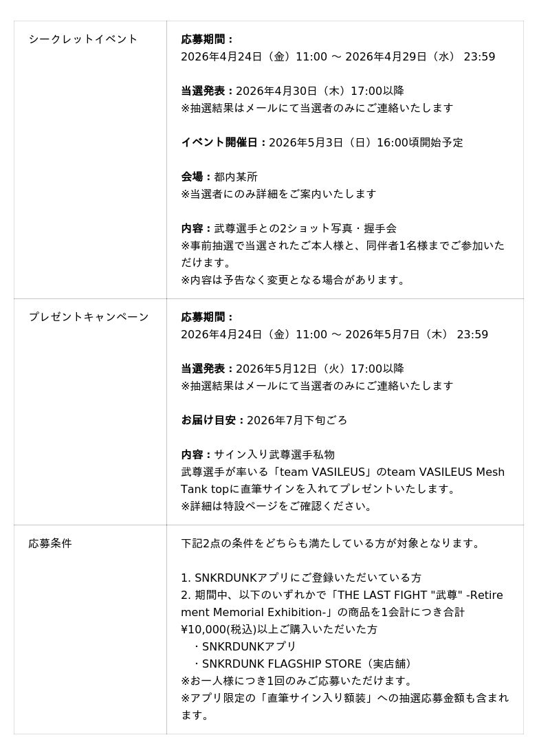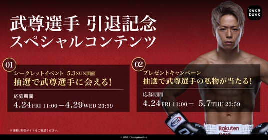 「SNKRDUNK(スニーカーダンク)」(以下、スニダン)を運営する株式会社SODA(本社:東京都渋谷区、代表取締役CEO:内山 雄太、以下SODA)は、プロ格闘家 武尊選手の引退を記念して、歴戦のシーンや武尊選手自らが厳選した「胸に熱く残る瞬間」をモチーフにした引退記念コラボレーションアイテムを、2026年4月24日(金)より、スニダン限定で販売いたします。