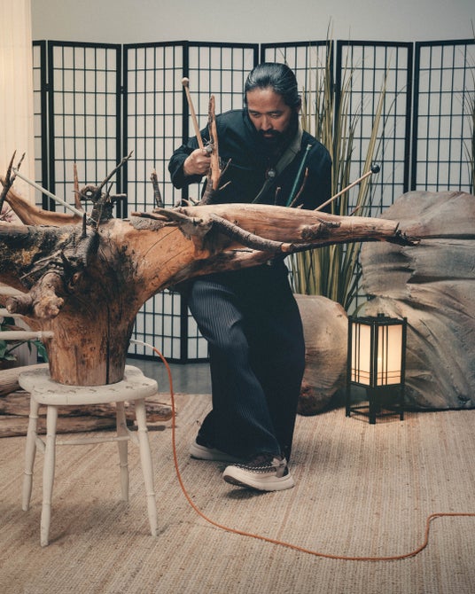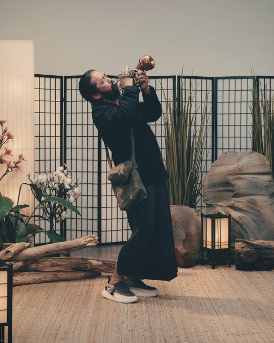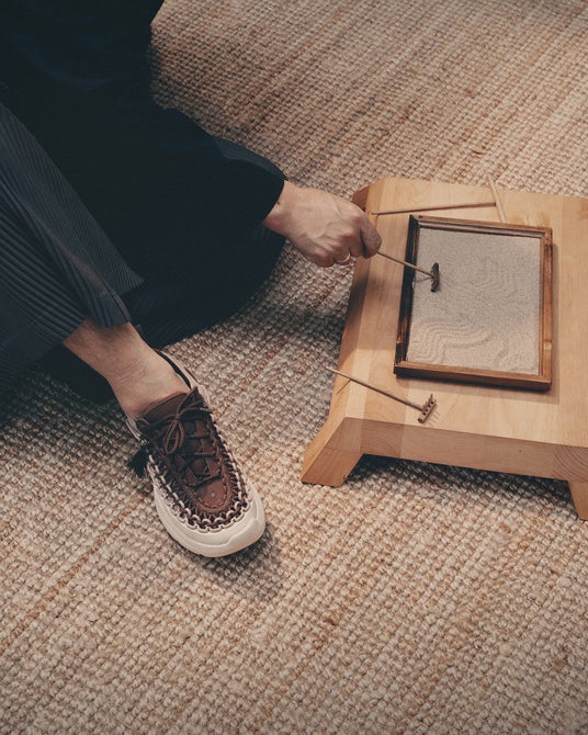 落ち着いた色彩とシームレスなラバー製マッドガードが、クリーンかつアウトドア調の仕上がりを実現。タッセルやリブ状のシューレースチップは、瞑想の所作を想起させるディテールとして、デザインに深みと象徴性を添えています。
